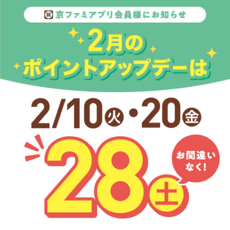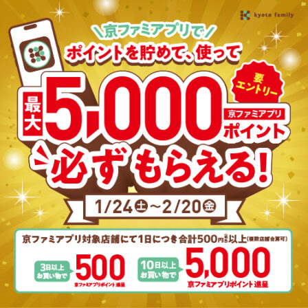 <1/24〜2/20>京ファミアプリでポイントを貯めて、使って最大5,000ポイントが必ずもらえる!キャンペーン開催