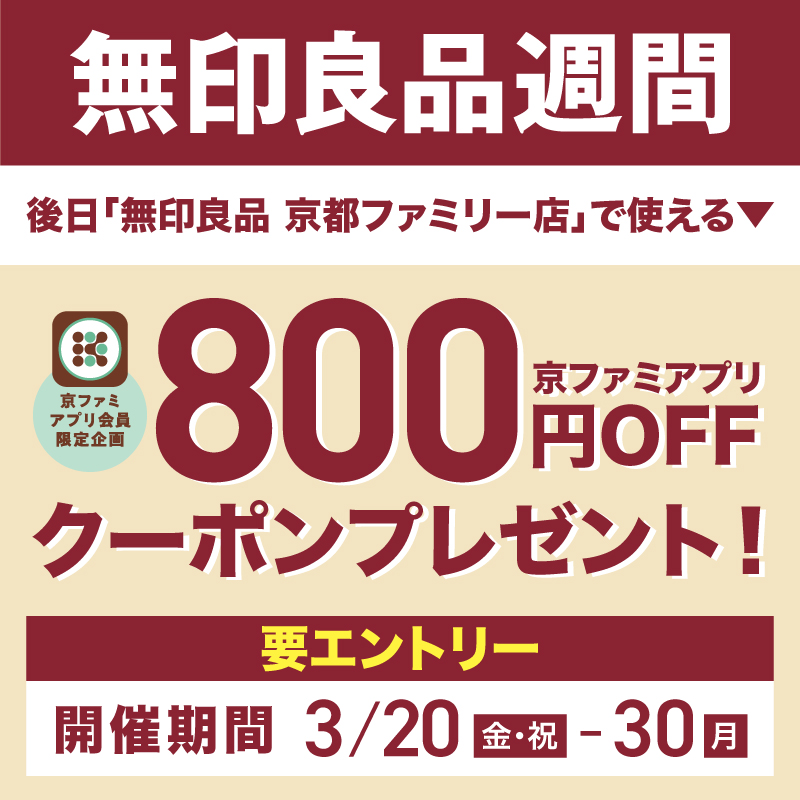 「無印良品週間」期間中、「無印良品 京都ファミリー店」で合計8,000円(税込・合算可)以上お買い上げ&京ファミアプリにてエントリーいただいた方の中から抽選で500名様に後日「無印良品 京都ファミリー店」で使える京ファミアプリ800円OFFクーポンをプレゼント!