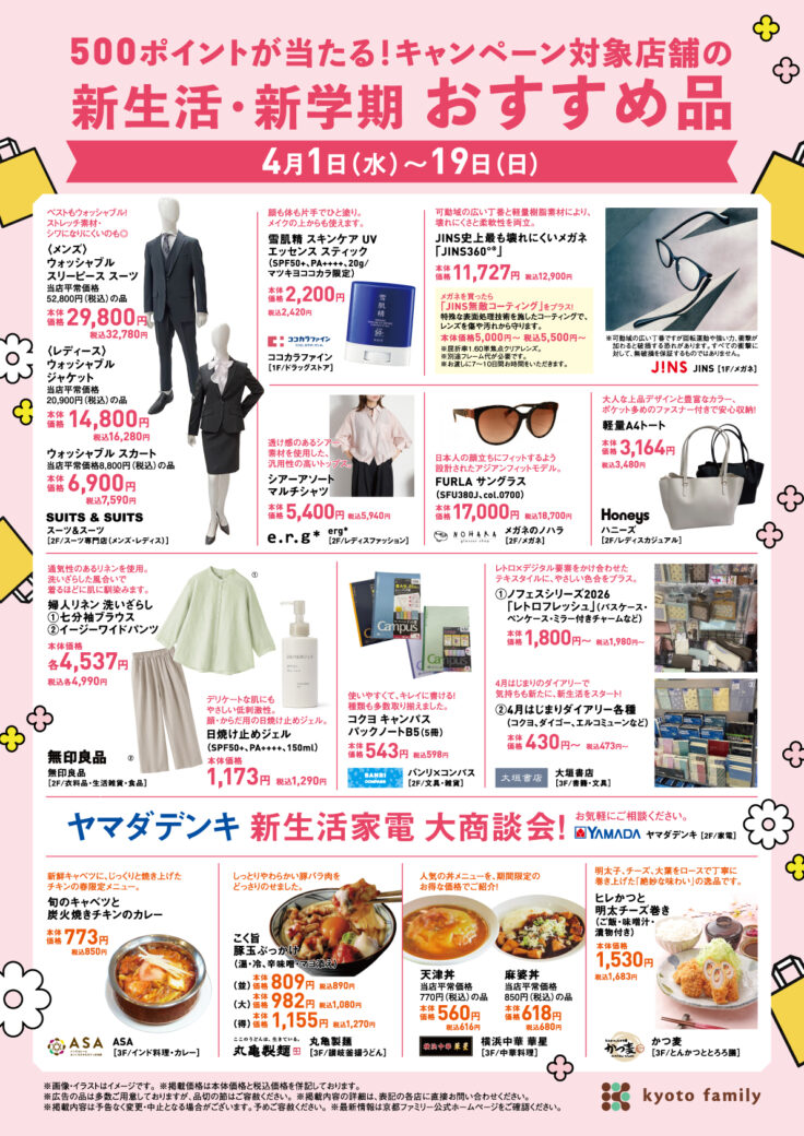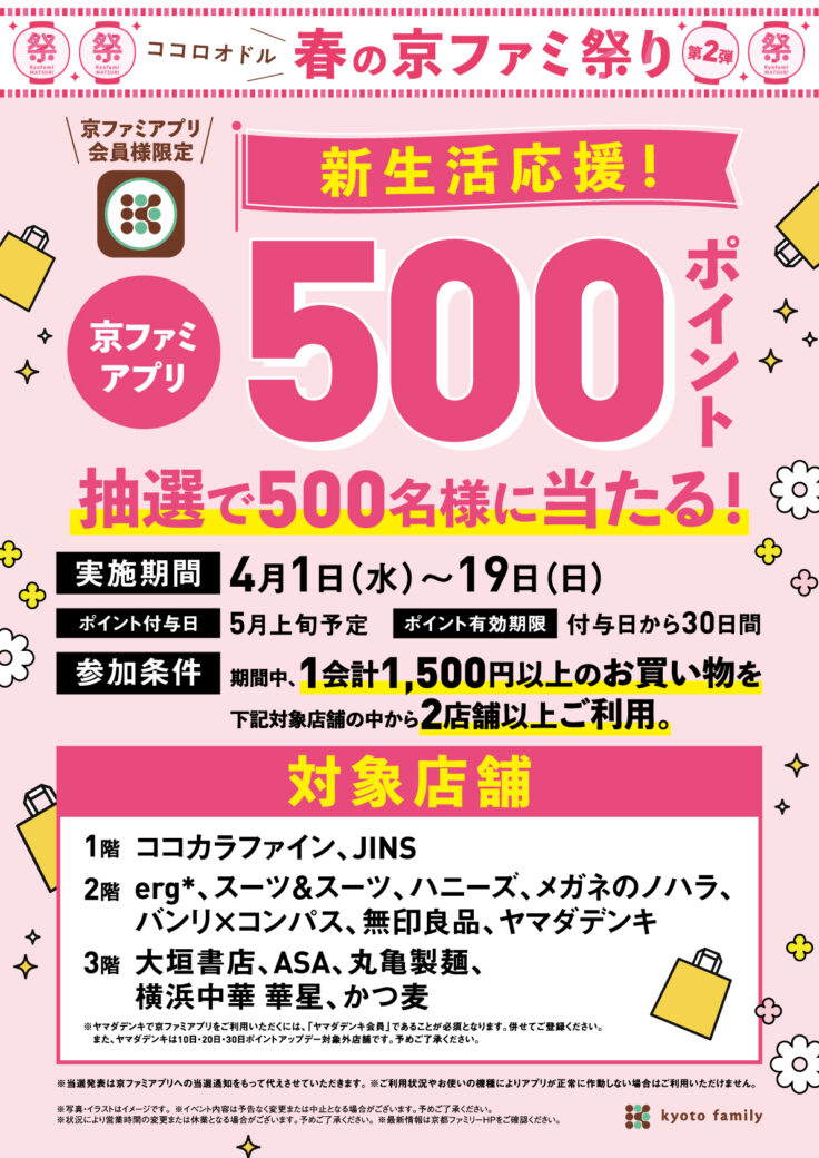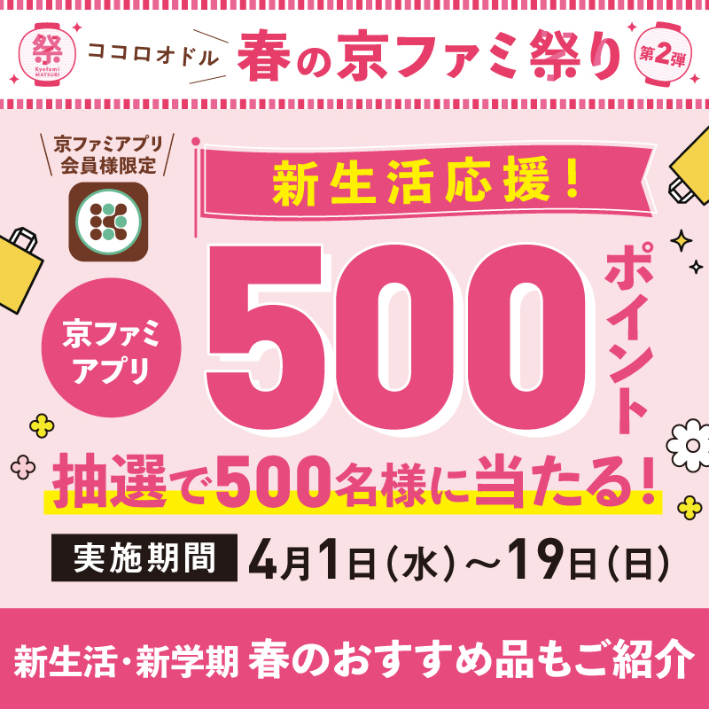 <4/1(水)〜19(日)>新生活応援!抽選で500名様に京ファミアプリ500ポイントが当たるキャンペーン!