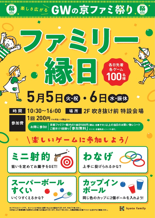 京都ファミリー館内の1会計500円(税込・合算不可)以上の当日のお買い物レシートご提示で1回限り「参加無料」