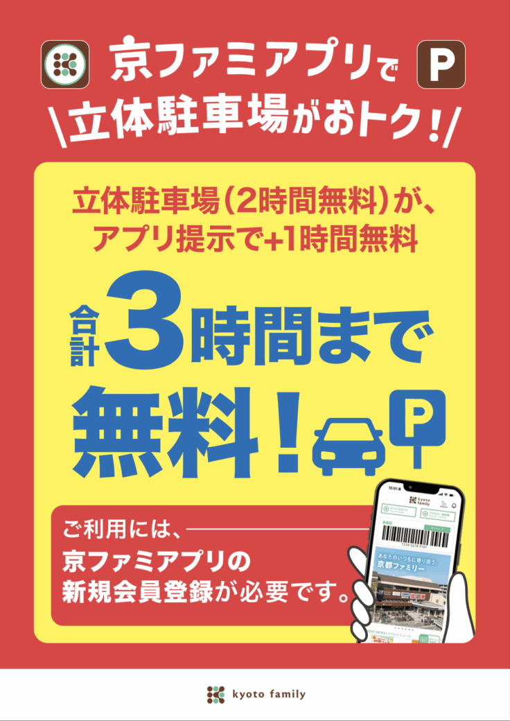 立体駐車場(2時間無料)利用が、京ファミアプリ提示(新規会員登録必須)で+1時間の
