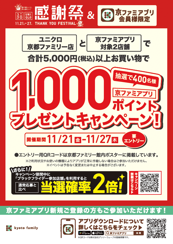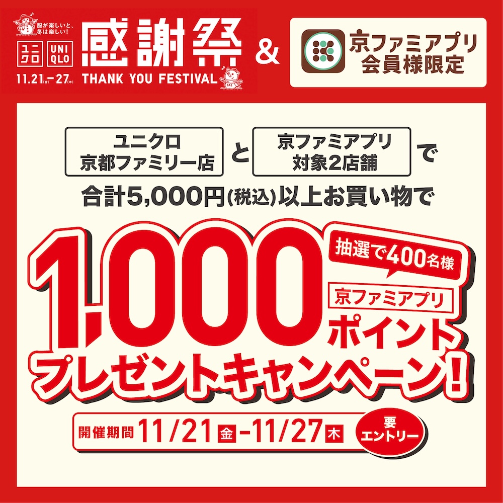 「ユニクロ京都ファミリー店」と「京ファミアプリ対象2店舗」で合計5,000円(税込)以上お買い物で