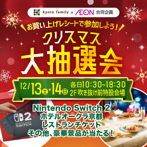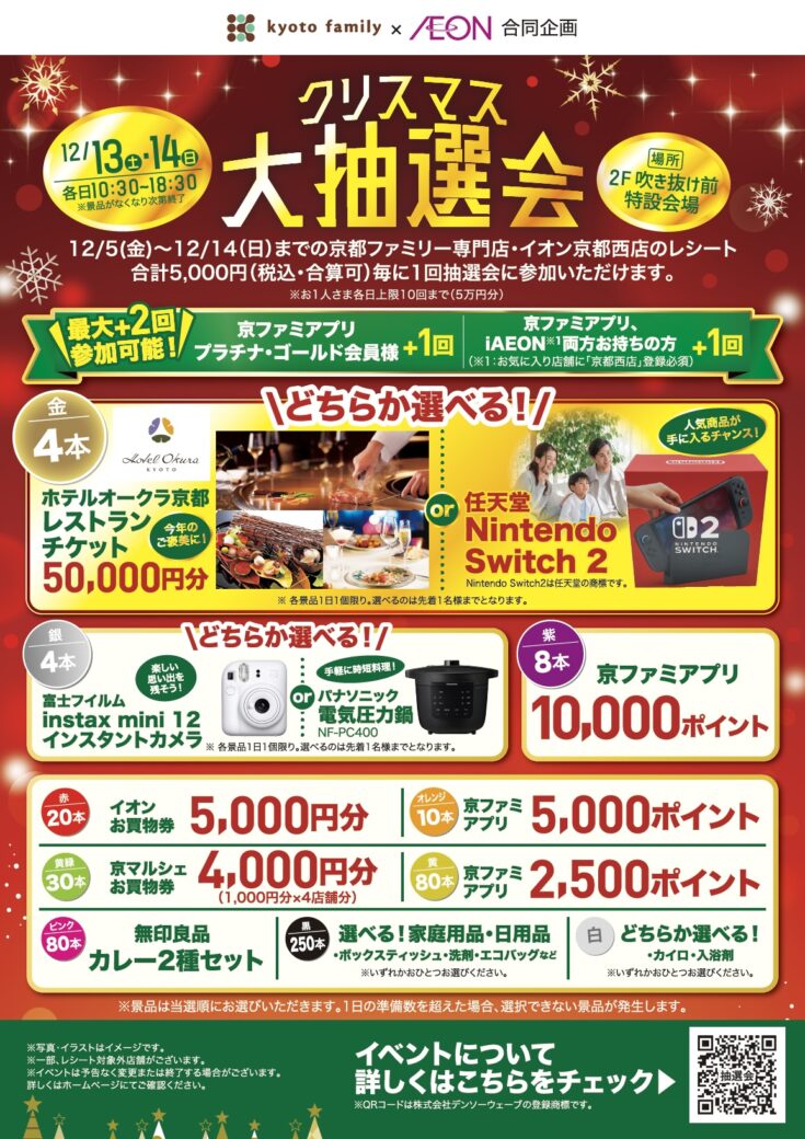 12/5(金)〜12/14(日)までの京都ファミリー専門店・イオン京都西店のレシート合計5,000円(税込・合算可)毎に1回抽選会に参加いただけます。(お1人さま各日上限10回まで(5万円分))