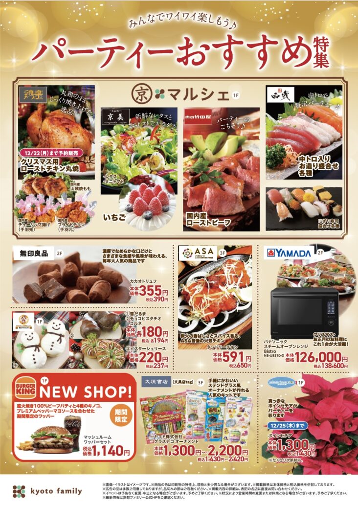 クリスマスや忘年会など、パーティーシーズンにおすすめなお食事・アイテムを各店舗にてご用意しております。