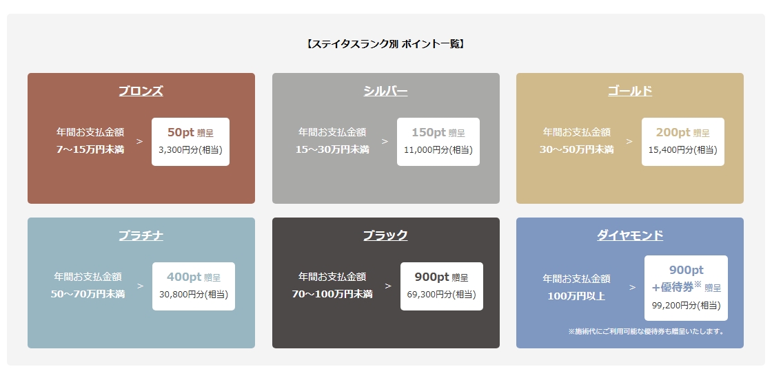 ステイタス会員様にはすでにランクに応じたポイントがプレゼントされておりますので、 ぜひマイページでご確認ください!