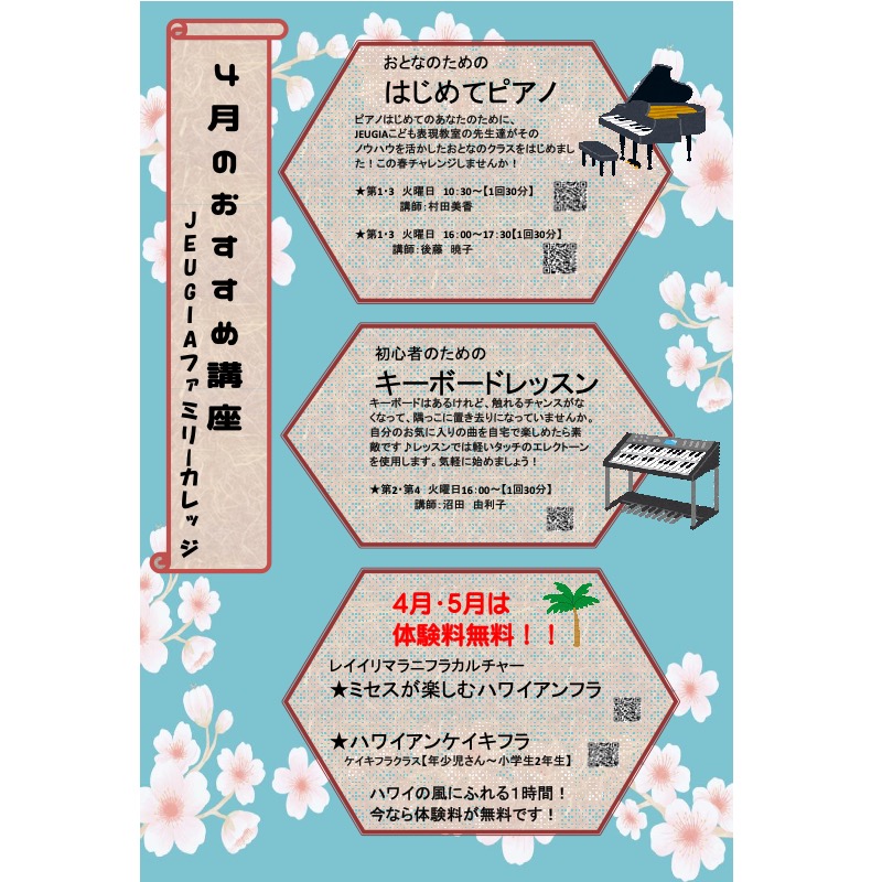 【JEUGIAファミリーカレッジ】4月オススメ講座