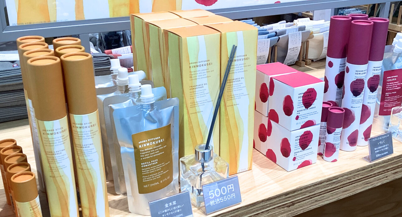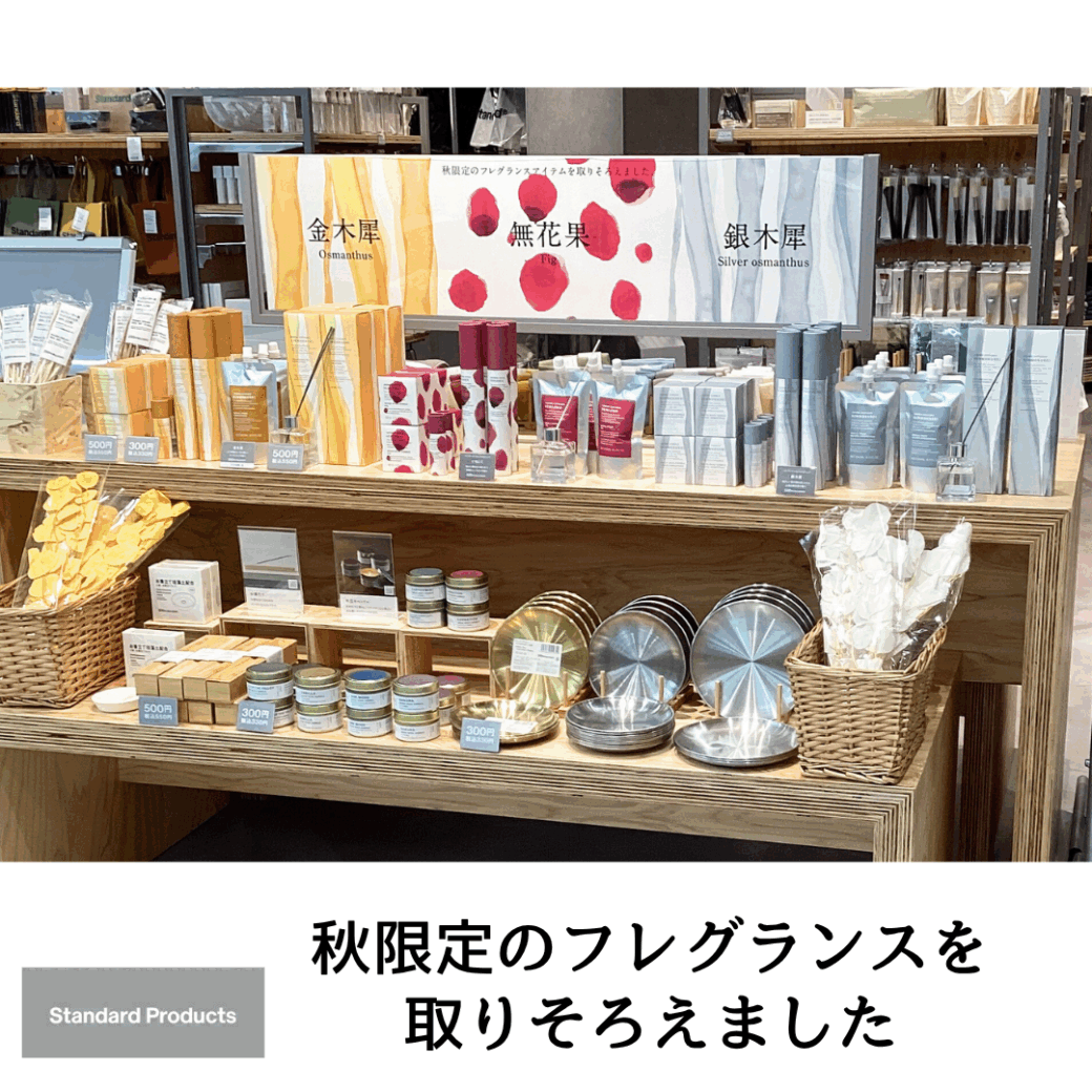 秋限定ルームフレグランス、金木犀(きんもくせい)、無花果(いちじく)、銀木犀(ぎんもくせい)、秋の香りをお楽しみください♪場所で香りを変えたり、キャンドルにしたり、気分で変えてみてください☆