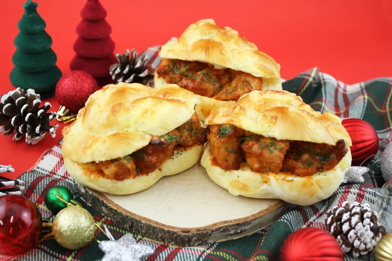 ふんわりとした食パン生地に、トマトガーリックソースを絡めたチキンをサンドしました。