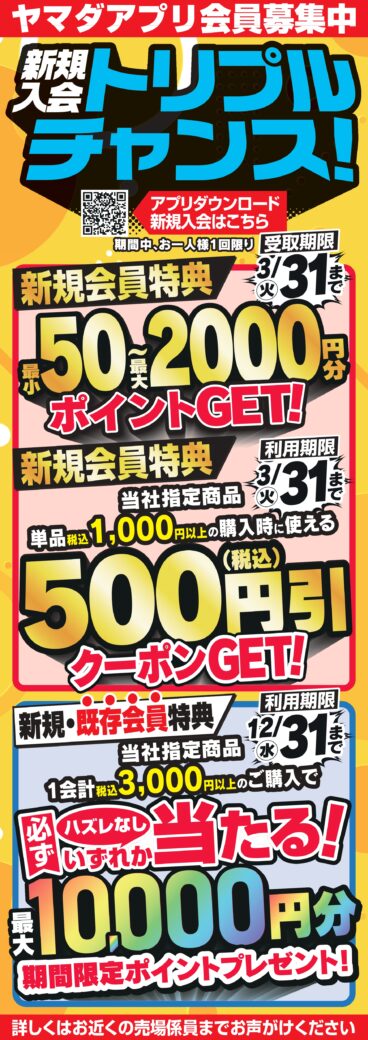 只今ヤマダアプリ新規会員様をご登録いただきますと